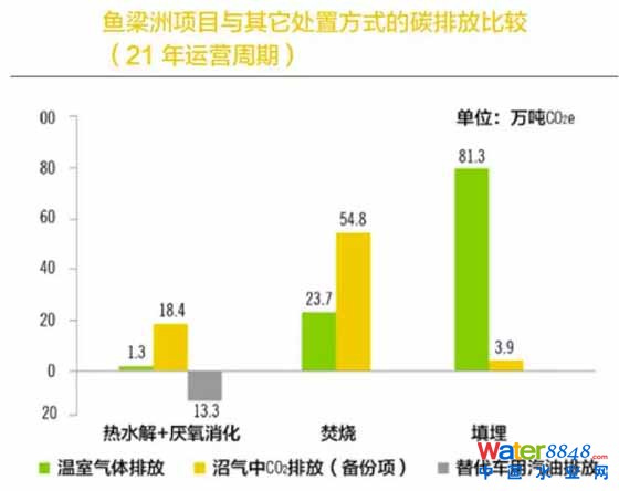 根據(jù)項目運行數(shù)據(jù)測算,魚梁洲項目在21年的運行期中可處置22.7萬噸污泥,共產(chǎn)生1.3萬噸二氧化碳當量排放(相當于年均產(chǎn)生606噸二氧化碳當量排放)。根據(jù)下圖,如果對相同規(guī)模的污泥和餐廚垃圾混合物按照相同運行周期(21年)采用填埋或焚燒進行處置,則將分別產(chǎn)生81.3萬噸二氧化碳當量或23.7萬噸二氧化碳當量的排放,是魚梁洲項目溫室氣體排放的62.5倍或18.2倍。