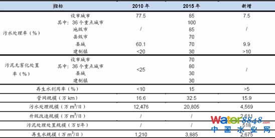 2012年4月,國(guó)務(wù)院發(fā)布《“十二五”全國(guó)城鎮(zhèn)污水處理及再生利用設(shè)施建設(shè)規(guī)劃》(以下簡(jiǎn)稱污水處理與再生“十二五”規(guī)劃),提出在“十一五”能力提高的基礎(chǔ)上,“十二五”期間,新建污水管網(wǎng)15.9萬(wàn)公里,新增污水處理規(guī)模45,69萬(wàn)m3/日,升級(jí)改造污水處理規(guī)模2,611萬(wàn)m3/日,新建污泥處理處臵規(guī)模518萬(wàn)t(干泥)/年,新建污水再生利用設(shè)施規(guī)模2,675萬(wàn)m3/日,實(shí)現(xiàn)到2015年末城市污水處理率達(dá)到85%、設(shè)市城市污泥無(wú)害化處理率達(dá)70%、城鎮(zhèn)污水處理設(shè)施再生水利用率達(dá)到15%以上。