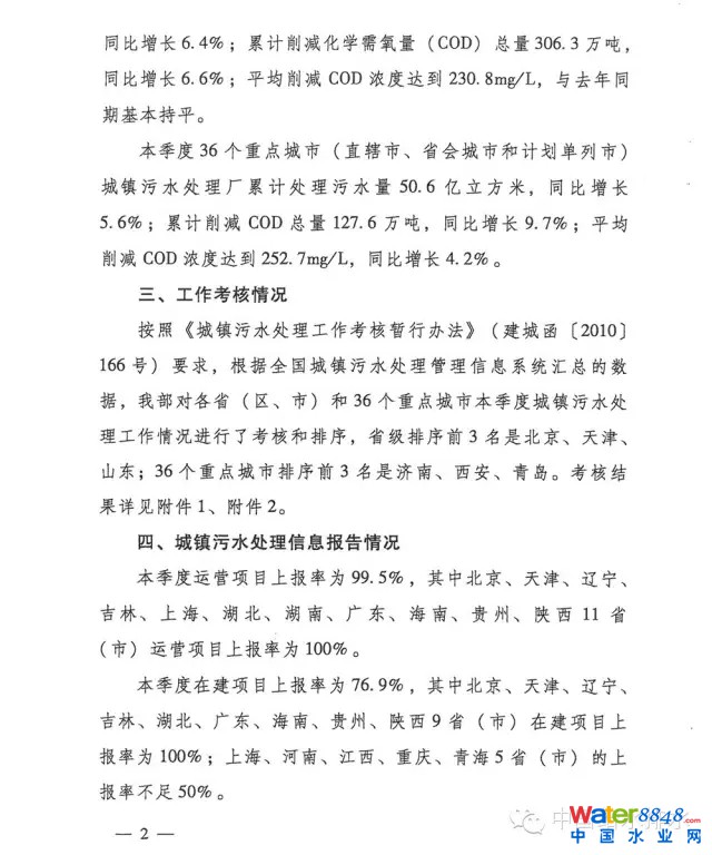 住建設(shè)部關(guān)于全國城鎮(zhèn)污水處理設(shè)施2015年第三季度建設(shè)和運行情況的通報如下圖,通報中對于城鎮(zhèn)污水處理情況作了詳細的說明,對于污水處理項目的情況也有說明。