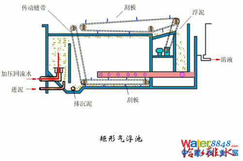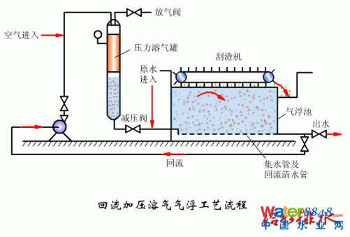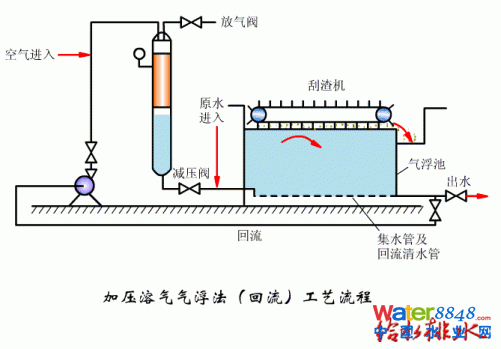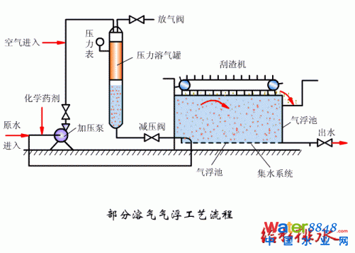 (2)布?xì)鈿飧》。這種方法的工作原理是將溶解在水中的空氣剪碎,常用葉輪氣浮、水泵吸水管吸氣浮、擴(kuò)散板曝氣浮以及射流氣浮等設(shè)備,這種方法易于操作和管理,并且耗能減小,但是無(wú)法準(zhǔn)確控制氣泡的破碎程度,上浮的效果就可能會(huì)受到影響;