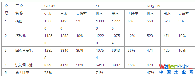 某養(yǎng)豬場(chǎng)地存欄生豬5000頭,養(yǎng)豬場(chǎng)實(shí)行雨污分離和干清糞工藝,廢水主要來(lái)自豬舍每天兩次的沖洗水,廢水總量50~60m3/d。原水水質(zhì):CODcr=15000mg/L,SS=12000mg/L,NH3-N=500mg/L,采用環(huán)保型處理工藝。廢水經(jīng)前處理后水質(zhì):CODcr=4170mg/L,SS=3802mg/L,NH3-N=292mg/L,處理效果明顯。
