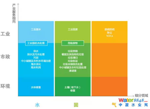 一個(gè)主要原因就是我們細(xì)分領(lǐng)域非常的復(fù)雜,E20提供一個(gè)九宮格分析方法,雖然不符合產(chǎn)業(yè)的分類。比如說(shuō)我們這兩維,一個(gè)是水固氣,一個(gè)是工業(yè)與工業(yè)之物的市場(chǎng),一個(gè)是市場(chǎng)服務(wù)的市場(chǎng),還有一個(gè)是環(huán)境修復(fù)和環(huán)境維護(hù)為主要目標(biāo)的市場(chǎng)。在這個(gè)橫軸上的水固氣,其實(shí)可以通過(guò)他們每一個(gè)污染介質(zhì),或者污染媒介的特性掌握他在產(chǎn)業(yè)中的企業(yè),主要面對(duì)的或者這些技術(shù)所要面對(duì)的問(wèn)題。比如大氣領(lǐng)域,很難對(duì)大氣直接進(jìn)行修復(fù)。一般存在的項(xiàng)目都是在我們右上角工業(yè)處理,他服務(wù)主要是EPC還有一個(gè)工程設(shè)備的空間。