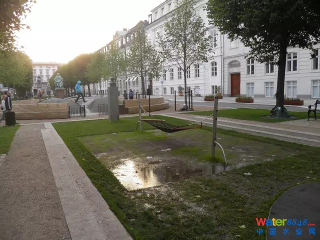 圣•安娜廣場是丹麥?zhǔn)锥嫉闹貥?biāo)之一,廣場狹長,一直延至新港。如今擴寬了街心公園,安置了休閑設(shè)施和兒童游樂場。但不惹人注意的變化細(xì)節(jié)是,兩旁新栽的樹間,每塊綠地都呈下凹式;路面用花崗巖石塊或厚木板鋪成,耐用、美觀,更重要的是:滲水。