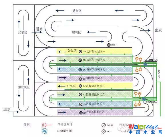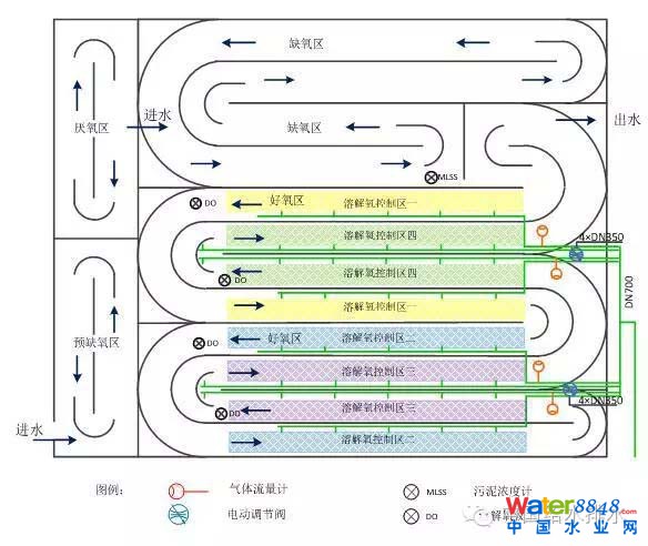 圖2按常規(guī)方式劃分的溶解氧控制區(qū)和儀表閥門配置(單座池)