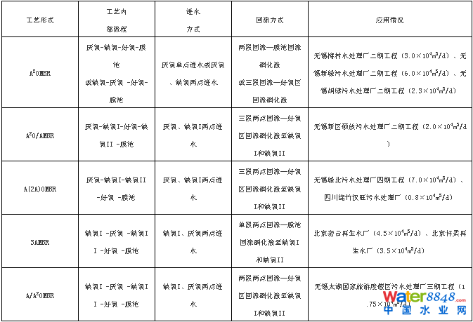 ④氣候條件等。從目前應(yīng)用的工程經(jīng)驗(yàn)來看,A2O及其變形強(qiáng)化工藝是眾多應(yīng)用在MBR脫氮除磷工藝中處理效果最為突出,運(yùn)行管理最為方便,也是最穩(wěn)定可靠的一類。表1介紹了目前各種形式的A2O及其改進(jìn)型的MBR脫氮除磷組合工藝的應(yīng)用情況。