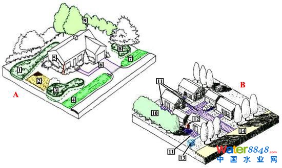 B 10. 密林保護(hù)區(qū);11. 可滲水鋪裝;12、13. 雨水收集器(常用于高密度住宅區(qū))14. 道路交通的處理手法