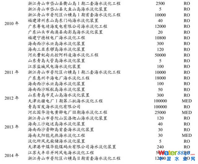 海水淡化工程主要集中在水價(jià)較高的沿海省份。已建成的海水淡化工程主要集中在水資源短缺的沿海9省:天津(31.73萬(wàn)噸/日)、山東(16.07萬(wàn)噸/日)、河北(16.87萬(wàn)噸/日)、遼寧(6.82萬(wàn)噸/日)、浙江(20.18萬(wàn)噸/日)、廣東(8.17萬(wàn)噸/日)、福建(1.17萬(wàn)噸/日)、江蘇(0.51噸/日)、海南(1.14萬(wàn)噸/日)。其中,北方以大規(guī)模的工業(yè)用海水淡化工程為主,主要集中在天津、河北、山東等地的電力、鋼鐵等高耗水行業(yè);南方以民用海島海水淡化工程居多,主要分布在浙江、福建、海南等地,以百噸級(jí)和千噸級(jí)工程為主。