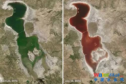 ▲今年4月23日,烏爾米湖的湖水還是綠色,但在7月18日變成血紅色。圖片來自NASA。