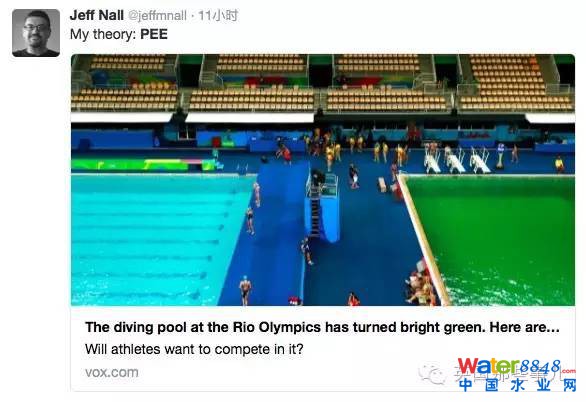 到底咋就變綠了?網(wǎng)友也開始了各種腦洞大開——有人說是巴西故意弄成綠色以此呼應(yīng)國旗的顏色;也有網(wǎng)友說,這是主辦方貼心,特地為運動員把泳池調(diào)成綠色,好緩解強日光對眼睛的刺激……
