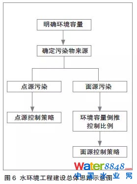 水環(huán)境工程首先需要明確環(huán)境容量,確定污染物來(lái)源,其次從點(diǎn)源和非點(diǎn)源兩個(gè)方面分別提出對(duì)策( 圖6)。點(diǎn)源控制措施主要是建設(shè)傳統(tǒng)污水系統(tǒng),通過完善雨污管道建設(shè),對(duì)點(diǎn)源污染物進(jìn)行控制。在新建區(qū)域?qū)嵭型耆晡鄯至;?duì)于已建設(shè)合流制的區(qū)域,短期改造為截流式合流制,逐步實(shí)現(xiàn)完全雨污分流。此外,改造和新建污水處理廠,建設(shè)再生水廠。非點(diǎn)源控制措施包括兩方面的內(nèi)容:一方面,合理配置生物滯留設(shè)施,對(duì)徑流污染進(jìn)行源頭削減,可以有效削減35%~45%的徑流污染( 削減809.4 噸/ 年的COD,31.4 噸/ 年的NH3-N,916.3噸/ 年的SS,4.5 噸/ 年的TP);另一方面,設(shè)置人工濕地系統(tǒng),對(duì)超出環(huán)境容量的剩余污染負(fù)荷進(jìn)行處理( 共處理1324.2 噸/ 年的COD,52.6 噸/ 年的NH3-N,1454.54 噸/ 年的SS,7.5 噸/年的TP)。