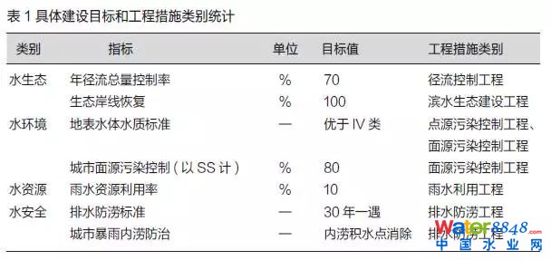 為了有效指導(dǎo)工程建設(shè),需要首先確定建設(shè)目標(biāo)。規(guī)劃參考住房和城鄉(xiāng)建設(shè)部發(fā)布的《海綿城市建設(shè)績(jī)效評(píng)價(jià)與考核辦法( 試行)》,結(jié)合區(qū)域的實(shí)際情況,分別從水安全、水環(huán)境、水生態(tài)和水資源等方面確定了總體建設(shè)目標(biāo),并明確了完成該類目標(biāo)的具體工程措施類別( 表1)。