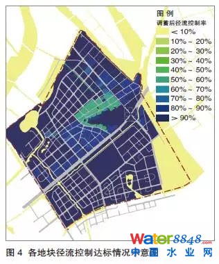 (1) 徑流控制工程。對(duì)于雨水徑流控制工程,首先需要確定年徑流總量控制率;其次分析現(xiàn)狀地塊達(dá)標(biāo)情況,劃定排水分區(qū),布設(shè)相關(guān)設(shè)施,調(diào)整未開發(fā)地塊的規(guī)劃指標(biāo);最后判斷排水分區(qū)是否整體達(dá)標(biāo),再確定調(diào)蓄工程。具體技術(shù)路線如圖3 所示。通過對(duì)現(xiàn)狀地塊的分析和新建地塊的指標(biāo)調(diào)整,可以明確全部地塊的達(dá)標(biāo)情況。經(jīng)過海綿設(shè)施改造和指標(biāo)調(diào)整發(fā)現(xiàn),約有75%的地塊滿足徑流控制要求( 圖4)。對(duì)于剩余不達(dá)標(biāo)的地塊,需要采用集中調(diào)蓄的方式,使排水分區(qū)整體達(dá)標(biāo),具體各分區(qū)調(diào)蓄要求如表2 所示。徑流控制工程共包括建筑與小區(qū)改造項(xiàng)目、待建項(xiàng)目和新建項(xiàng)目,綠地改造項(xiàng)目、新建項(xiàng)目,道路改造項(xiàng)目、待建項(xiàng)目和新建項(xiàng)目。建筑與小區(qū)改造居住及公建項(xiàng)目53 個(gè),待建居住及公建項(xiàng)目40 個(gè),新建居住及公建項(xiàng)目的用地面積為1178hm²;綠地改造項(xiàng)目的用地面積為86hm²,新建項(xiàng)目的用地面積為371hm²;道路工程共改造道路3 條,待建道路1 條,新建道路25 條( 圖5)。