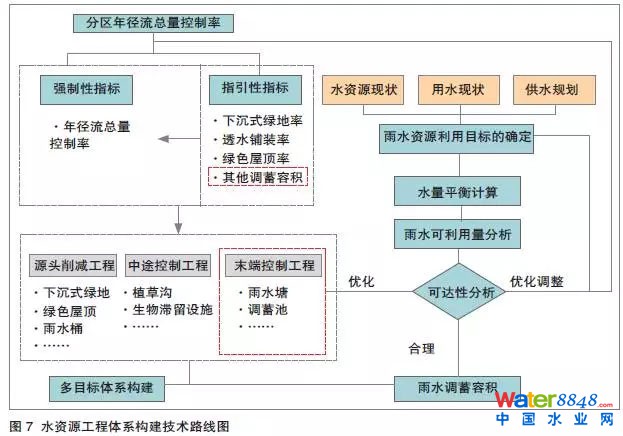 水資源工程體系的構(gòu)建主要分為雨水資源利用目標(biāo)的確定、水量平衡計(jì)算、雨水可利用量分析及可達(dá)性分析四個(gè)步驟( 圖7)。首先,根據(jù)本地水資源現(xiàn)狀資料、現(xiàn)狀用水?dāng)?shù)據(jù)及供水規(guī)劃,初步明確雨水利用方式和雨水資源利用目標(biāo)。其次,基于下墊面數(shù)據(jù)、降雨和蒸發(fā)的相關(guān)資料,對(duì)區(qū)域進(jìn)行全年水量平衡計(jì)算。最后,針對(duì)雨水利用對(duì)象,進(jìn)行雨水可利用量分析,基于低影響開發(fā)雨水調(diào)蓄工程進(jìn)行可達(dá)性分析,校核是否滿足雨水利用目標(biāo)。若出現(xiàn)雨水資源利用量過大的情況,應(yīng)優(yōu)化調(diào)整雨水資源利用目標(biāo)和雨水調(diào)蓄工程,直到校核完成,得到雨水調(diào)蓄容積,構(gòu)建水資源與水生態(tài)多目標(biāo)體系。通過在綠地、道路、建筑與小區(qū)布置不同類型的雨水資源利用和調(diào)蓄設(shè)施,并對(duì)景觀水體進(jìn)行改造,發(fā)揮調(diào)蓄功能,最終實(shí)現(xiàn)129.1 萬(wàn)立方米的調(diào)蓄容積。