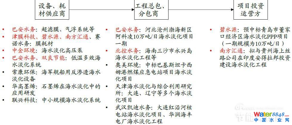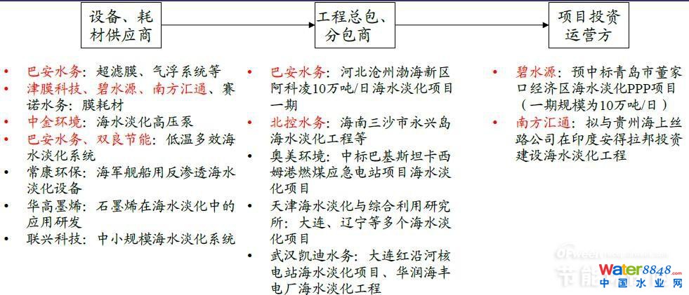 巴安水務(wù)、碧水源、賽諾水務(wù)(天壕環(huán)境)等公司深入布局國內(nèi)海水淡化產(chǎn)業(yè)鏈。1)設(shè)備耗材供應(yīng)商:巴安水務(wù):超濾膜、氣浮系統(tǒng)等;津膜科技、碧水源、南方匯通、賽諾水務(wù)生產(chǎn)膜耗材;中金環(huán)境生產(chǎn)海水淡化高壓泵;巴安水務(wù)、雙良節(jié)能生產(chǎn)低溫多效海水淡化系統(tǒng);常康環(huán)保(新三板公司)生產(chǎn)海軍艦船用反滲透海水淡化設(shè)備;聯(lián)興科技(新三板公司)生產(chǎn)中小規(guī)模海水淡化系統(tǒng)。2)工程總包分包商:巴安水務(wù)參與河北滄州渤海新區(qū)阿科凌10萬噸/日海水淡化項目一期;北控水務(wù)參與海南三沙市永興島海水淡化工程等;奧美環(huán)境(新三板公司)參與中標(biāo)巴基斯坦卡西姆港燃煤應(yīng)急電站項目海水淡化項目;天津海水淡化與綜合利用研究所參與大連、遼寧等多個海水淡化項目,項目經(jīng)驗豐富;武漢凱迪水務(wù)參與大連紅沿河核電站海水淡化項目、華潤海豐電廠海水淡化工程。3)項目投資運營方:碧水源預(yù)中標(biāo)青島市董家口經(jīng)濟區(qū)海水淡化PPP項目(一期規(guī)模為10萬噸/日);南方匯通擬與貴州海上絲路公司在印度安得拉邦投資建設(shè)海水淡化工程。