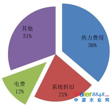 從成本結(jié)構(gòu)來看,能源成本占到噸水成本的四成到五成。能源成本是噸水成本的重要組成部分,占到反滲透法噸水成本的45%左右、占到低溫多效蒸餾法的近50%(其中3/4是熱力費用、1/4是電費)。反滲透法的噸水電耗在4度電左右;蒸餾法噸水電耗相對較小,在1.5度電左右。
