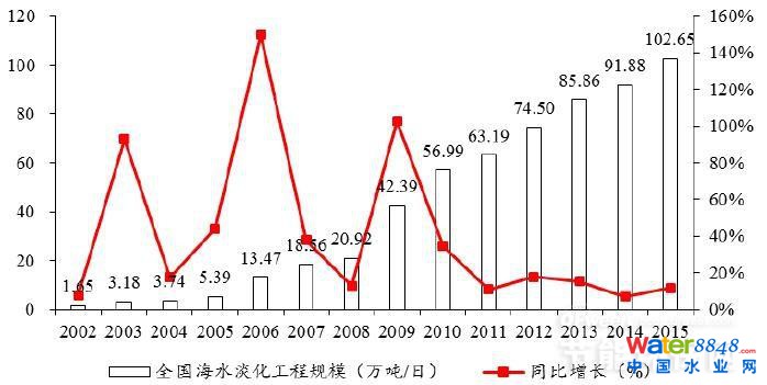 導(dǎo)讀: 2015年年底,我國海水淡化工程規(guī)模達(dá)到102.65萬噸/日,5年復(fù)合增長率12.5%。作為水資源缺乏的用水大國,我國海水淡化發(fā)展規(guī)模與海外相比有較大差距,僅為世界規(guī)模的1.2%。