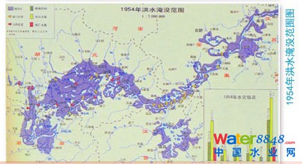1954年,長江中下游地區(qū)雨季提前到來,洪水發(fā)生也比一般年份早,洞庭湖、鄱陽湖水系于4月份即進(jìn)入汛期,長江中下游干流高水位持續(xù)時(shí)間長,漢口至南京江段水位自6月25日起全線超過警戒水位,超警歷時(shí)一般在100天~135天,中下游洪水位全線突破當(dāng)時(shí)的歷史最高值。長江中下游洪水與川水遭遇,形成全流域性大洪水。該年該年長江上游宜昌站最大洪峰流量66 800 m3/s,在無奈情況下考慮荊江分洪方案,雖保住武漢市,但受災(zāi)人口1890萬,被淹房屋427.66萬間,淹死3.4萬人,淹沒良田317萬公頃,受災(zāi)縣市123個(gè),京廣鐵路不能通車達(dá)100天,損失數(shù)十億元。在荊江采取分洪措施后,沙市最高水位仍達(dá)44.67m;中游漢口站最高水位29.73m,超過1931年的最高水位,相應(yīng)流量76 100 m3/s;下游大通站最高水位16.64m,相應(yīng)流量92 600 m3/s。最大30天洪量,1954年分洪潰口水量達(dá)1 023億m3【圖為】1954年的武漢洪水,漢口著名的標(biāo)致性建筑物——江漢關(guān)的街道上已成澤國