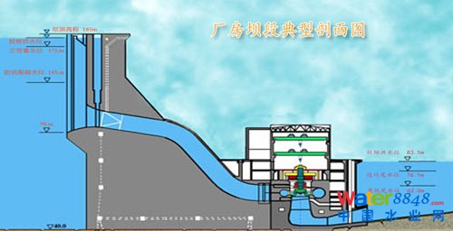 三峽大壩為混凝土重力壩,它壩長2335m,底部寬115m,頂部寬40m,壩頂高程為海拔185m,最大澆筑壩高181m,正常蓄水位海拔175m。大壩下游的水位約海拔66m,壩下通航最低水位海拔62m,通航船閘上下游設(shè)計(jì)最大落差113m。工程主體建筑物的土石方挖填量約1.34m3,混凝土澆筑量約2794萬m3,耗用鋼材59.3萬噸。其中金屬結(jié)構(gòu)安裝占25.65萬噸,鋼筋制作安裝46.30萬噸。水庫全長600余km,壩軸線全長2309.47m,水面平均寬度1.1km,總面積1084km2,總庫容393億m3,其中調(diào)洪庫容約221.5億m3,調(diào)節(jié)能力為季調(diào)節(jié)型【圖為】三峽水利樞紐工程廠房壩段模型剖面圖。