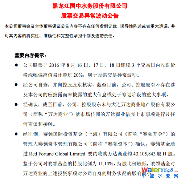 8月19日 國(guó)中水務(wù)發(fā)布公告稱(chēng) , 未與萬(wàn)達(dá)商業(yè)就市場(chǎng)傳聞的借殼上市進(jìn)行過(guò)任何商談和接觸。