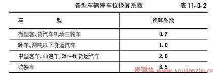 11.0.2.7 停車場車位數(shù)的確定以小型汽車為標(biāo)準(zhǔn)當(dāng)量表示,其它各型車輛的停車位,應(yīng)按表11.0.2中相應(yīng)的換算系數(shù)折算。