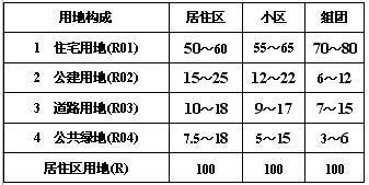 居住區(qū)用地包括住宅用地、公共服務(wù)設(shè)施用地(也稱公建用地)、道路用地和公共綠地四項,它們之間存有一定的比例關(guān)系,主要反映土地使用的合理性與經(jīng)濟性,它們之間的比例關(guān)系及每人平均用地水平是必要的基本指標(biāo)。在規(guī)劃范圍內(nèi)還包括一些與居住區(qū)沒有直接配套關(guān)系的其他用地,如外圍道路或保留的企事業(yè)單位、不能建設(shè)的用地、城市級公建用地、城市干道、自然村等,這些都不能參與用地平衡,否則無可比性。但“其他用地” 在居住區(qū)規(guī)劃中也必定存在(外圍道路),因此它也是一個基本指標(biāo),居住區(qū)用地加“其他用地”即為居住區(qū)規(guī)劃總用地。
