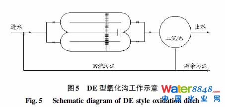 該類氧化溝系統(tǒng)設(shè)有單獨的二沉池,實現(xiàn)曝氣和沉淀的完全分離。最典型的半交替工作式氧化溝就是DE 型39 卷23 期 郭昌梓等 氧化溝的優(yōu)缺點及發(fā)展應(yīng)用型式 14289氧化溝。DE 型氧化溝是指由2 個相同容積的氧化溝組成的雙溝半交替工作系統(tǒng),具有良好的生物除氮功能。2 個氧化溝相互連通,串聯(lián)運行,可交替進出水,終沉池與氧化溝分建,有獨立的污泥回流系統(tǒng)。氧化溝內(nèi)曝氣轉(zhuǎn)刷一般為雙速,高速工作時為曝氣充氧,低速運行時只推動水流,不充氧。通過2 溝內(nèi)轉(zhuǎn)刷交替處于高速和低速運行,可使2 溝交替處于缺氧和好氧狀態(tài),從而達到脫氮的目的( 圖5) 。它與D 型、T 型氧化溝不同之處是氧化溝與二沉池分開,有獨立的污泥回流系統(tǒng)。