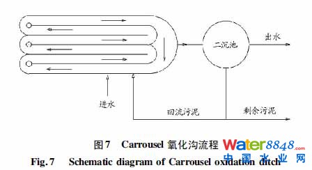 采用立式低速表面曝氣器供氧并推動水流前進。Carrousel 氧化溝為多溝串聯(lián)系統(tǒng),其特點是表面曝氣器設(shè)于每溝的端頭,在系統(tǒng)中形成好氧、缺氧區(qū),有利于生物脫氮( 圖7) 。由于倒傘型立式表曝機攪拌能力強,傳氧效率高,設(shè)備數(shù)量少,易于管理和維護,所以節(jié)能效果顯著。因此,Carrousel 氧化溝適用于處理規(guī)模較大的污水處理廠,在所有氧化溝處理工藝中應(yīng)用最為廣泛,是目前世界上最流行的氧化溝系統(tǒng)。