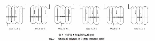 是3 溝交替運行系統(tǒng)( 圖3) ,由3 個池容相同的氧化溝組建在一起,3溝連通,進水交替進入各溝,從兩側(cè)的邊溝出水,兩側(cè)氧化溝起曝氣和沉淀雙重作用,中間的氧化溝始終進行曝氣,不設(shè)二沉池及污泥回流裝置,具有去除BOD5及硝化脫氮的功能。T 型氧化溝可按6 個或8個階段運行,運行周期一般為8 h。中溝始終作為曝氣池使用,側(cè)溝交替作為曝氣池和沉淀池運行,提高了轉(zhuǎn)刷的利用率。
