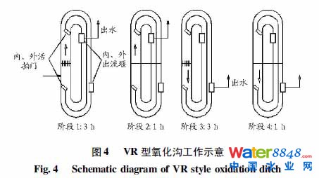 是單溝交替運行系統(tǒng)( 圖4) ,其構(gòu)造特點是將氧化溝分成容積基本相等的2 部分,其間有單向活拍門相連,利用定時改變曝氣轉(zhuǎn)刷的旋轉(zhuǎn)方向來改變溝內(nèi)水流方向,使2 部分氧化溝交替地作為曝氣區(qū)和沉淀區(qū),不需設(shè)二沉池和污泥回流裝置。VR 型氧化溝有2 道單向活拍門和2 道出水堰,可實現(xiàn)連續(xù)進水或間歇進水。一般一個工作周期為8 h,分4 個階段,操作簡便,機械設(shè)備少,出水水質(zhì)穩(wěn)定良好,其轉(zhuǎn)刷的實際利用率可達到75.0%。