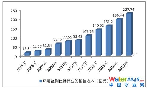 中國環(huán)境監(jiān)測儀器行業(yè)的銷售收入逐年增加,由2005年的15.84億元上升為2015年的227.74億元。近幾年我國環(huán)境監(jiān)測儀器行業(yè)的銷售收入情況如下圖所示: