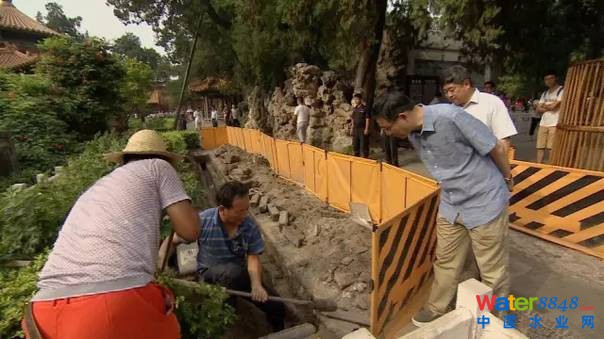 御花園里正在對(duì)地下排水系統(tǒng)進(jìn)行清理。很多進(jìn)水口都在地下,清理時(shí)候發(fā)現(xiàn)全都被淤泥、垃圾、雜草甚至有觀眾扔的一些東西堵住。現(xiàn)在一點(diǎn)一點(diǎn)清理出來(lái)以后,重新恢復(fù)排水的功能,這樣,御花園的排水就更強(qiáng)大了。