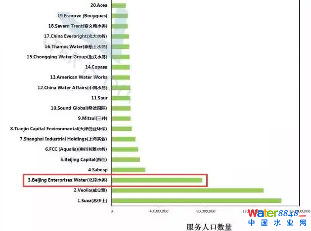 在這份全球TOP40名單中,共有13家中國水務(wù)公司入圍,包括北控水務(wù)(第三位)、首創(chuàng)股份(第五位)、上海實(shí)業(yè)、天津創(chuàng)業(yè)環(huán)保、桑德國際、中國水務(wù)、重慶水務(wù)、光大水務(wù)、康達(dá)國際、粵海投資、江西洪城水業(yè)、中信水務(wù)、國禎環(huán)保等,體現(xiàn)了中國水務(wù)企業(yè)近年來迅速發(fā)展,擁有眾多的水務(wù)資產(chǎn)和廣泛的服務(wù)人口。