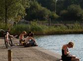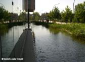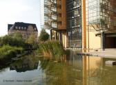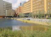 A complex computer simulation was used to predict that the Landwehrkanal would only be compelled to absorb heavily increased amounts of precipitation three times in ten years; this is based on the approximate drainage figures for an unsealed plot. To guarantee this, the system must carry sufficient buffer capacity. This is provided in the first place by five underground tanks with a total volume of 2,600 cubic metres, of which 900 cubic metres are left free in their turn for cases of heavy precipitation. In addition to this, the main area of water can still offer a reserve of 15 centimetres between the normal and the maximum water level, which provides a storage buffer of 1,300 cubic metres. A key feature was the water resources that were discovered above the turbidity level of the main area of water. Solids can start to settle in the underground tanks before the water flows out of source vessels on the banks of the south and main areas of water, through planted purification biotopes, where it is cleaned biologically and chemically.