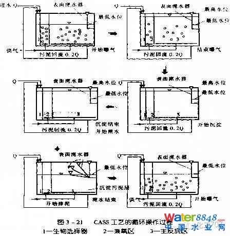 CASS工藝集反應(yīng)、沉淀、排水、功能于一體,污染物的降解在時間上是一個推流過程,而微生物則處于好氧、缺氧、厭氧周期性變化之中,從而達(dá)到對污染物去除作用,同時還具有較好的脫氮、除磷功能。