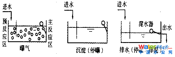 SBR工藝的基本運(yùn)行模式由進(jìn)水、反應(yīng)、沉淀、出水和閑置五個基本過程組成,從污水流入到閑置結(jié)束構(gòu)成一個周期,在每個周期里上述過程都是在一個設(shè)有曝氣或攪拌裝置的反應(yīng)器內(nèi)依次進(jìn)行的。