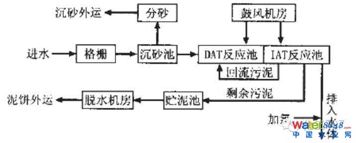 DAT池和IAT池串聯(lián)組成,DAT 連續(xù)進(jìn)水,連續(xù)曝氣(也可間歇曝氣),IAT也是連續(xù)進(jìn)水,但間歇曝氣,清水和剩余活性污泥均由IAT池排出。和典型的SBR 反應(yīng)池一樣,IAT 池運(yùn)行操作由進(jìn)水、反應(yīng)、沉淀、出水和待機(jī)5個階段組成。