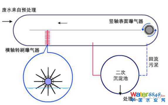 氧化溝是延時曝氣法的一種特殊形式,它的池體狹長,池深較淺,在溝槽中設(shè)有表面曝氣裝置。