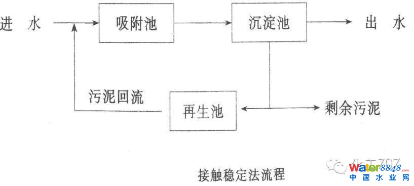 混合液曝氣過程中第一階段BOD5的下降是由于吸附作用造成的,對于溶解的有機(jī)物,吸附作用不大或沒有,因此,把這種方法稱為接觸穩(wěn)定法,也叫吸附再生法;旌弦旱钠貧馔瓿闪宋阶饔,回流污泥的曝氣完成穩(wěn)定作用。