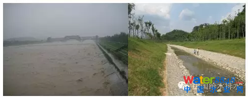 防洪河道以保證洪水順利排放為主,斷面按照5年一遇洪水位為分界線,5年一遇洪水位以下采用人工硬質(zhì)護(hù)岸,增強過流能力,防止堤岸被過度沖刷,節(jié)省建設(shè)用地;5年一遇洪水位以上采用生態(tài)自然護(hù)岸,滿足景觀要求。對主要承擔(dān)城市內(nèi)部排水功能和景觀功能的河道,全部采用生態(tài)護(hù)岸,雨水以蓄滯為主,緩釋慢排。北川新縣城河道建設(shè)實景見圖3。