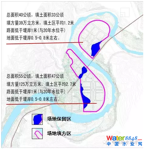 規(guī)劃建設(shè)過程中,利用周邊丘陵場地平整時多余土方,將現(xiàn)狀場地整體高程提高3~4米,不低于青竹江20年一遇洪水高程,在合理開發(fā)鎮(zhèn)區(qū)周邊建設(shè)用地的同時,保證了土方的合理利用,保證了梁沙壩和史家壩排水防澇安全。竹園鎮(zhèn)區(qū)道路、場地土方工程量與洪水位的關(guān)系見圖4。
