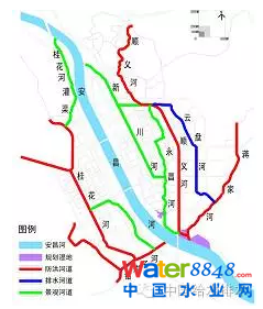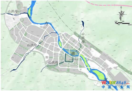 四川省綿陽市北川新縣城,汶川大地震后唯一異地新建的縣城,原址為安昌河的山前沖積帶,西部典型的河壩地區(qū),規(guī)劃占地面積7平方公里,現(xiàn)狀建成區(qū)面積5平方公里。北川新縣城建設(shè)過程中,水系構(gòu)建以打造羌族特色的水系景觀為理念,利用其內(nèi)部天然水系與農(nóng)業(yè)灌渠規(guī)劃了8條主要水系,其中以防洪為主要功能的4條,以排水為主的2條,以景觀為主的2條,具體見圖2。