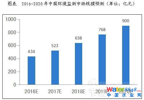 隨著國家對環(huán)境監(jiān)測行業(yè)的政策傾斜和資金投入加大,整個社會對環(huán)境問題的關(guān)注度提升,環(huán)境監(jiān)測站點(diǎn)增加以及環(huán)境監(jiān)測技術(shù)升級,環(huán)境監(jiān)測行業(yè)“十三五”期間將延續(xù)前幾年的行業(yè)景氣度,預(yù)測,2020年環(huán)境監(jiān)測行業(yè)市場規(guī)模有望突破900億元,五年復(fù)合增速約為20%左右。