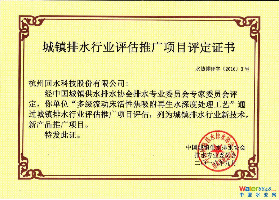 中國(guó)城鎮(zhèn)供水排水協(xié)會(huì)排水專(zhuān)業(yè)委員會(huì)于2016年9月11日在鄭州新區(qū)污水處理廠組織召開(kāi)了杭州回水科技股份有限公司“多級(jí)流動(dòng)床活性焦吸附再生水深度處理工藝”專(zhuān)家評(píng)審會(huì)。