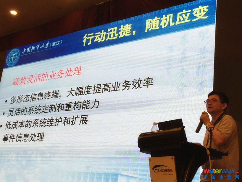 報(bào)告強(qiáng)調(diào)了智慧水務(wù)建設(shè)的核心理念:一、以長(zhǎng)治久安為目標(biāo),設(shè)計(jì)建立開放式可擴(kuò)展架構(gòu);二、以GIS 為基礎(chǔ),實(shí)現(xiàn)數(shù)據(jù)融合和全局可視;三、以數(shù)據(jù)為核心,用管理機(jī)制和技術(shù)手段維護(hù)數(shù)據(jù)的準(zhǔn)確性、現(xiàn)勢(shì)性和完整性;四、以業(yè)務(wù)協(xié)同、流程優(yōu)化為抓手,迅速見效,滾動(dòng)發(fā)展;五、以移動(dòng)互聯(lián)為突破,實(shí)現(xiàn)信息的通暢流轉(zhuǎn)和便捷利用。該報(bào)告以“常熟中法水務(wù)智慧水務(wù)系統(tǒng)”為例,講述了“以GIS為基礎(chǔ)的智慧水務(wù)解決方案”如何實(shí)現(xiàn)水司供水管網(wǎng)智慧運(yùn)作和科學(xué)管理。曾文教授的精彩報(bào)告贏得了全場(chǎng)的熱烈掌聲,獲得了廣泛的肯定。