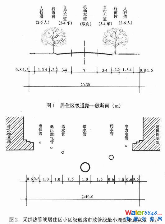 小區(qū)級(jí)道路車行道的最小寬度為6m,如兩側(cè)各安排一條寬度為1.5m的人行路,總寬度為9m,即可滿足一般功能需要。同時(shí),小區(qū)級(jí)道路往往又是市政管線埋沒的通道,在無供熱管線的居住區(qū)內(nèi),按六種基本管線的最小水平間距,它們?cè)诮ㄖ之間的最小極限寬度約為10m(圖2),此距離與小區(qū)級(jí)道路交通車行、人行所需寬度基本一致。