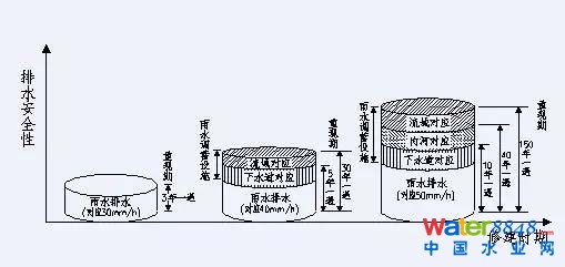 圖1引自《日本下水道設(shè)計(jì)指南》(2001年版)中日本橫濱市鶴見川地區(qū)的“不同設(shè)計(jì)重現(xiàn)期標(biāo)準(zhǔn)的綜合應(yīng)對(duì)措施”。圖1反映了該地區(qū)從單一的城市排水管道排水系統(tǒng)到包含雨水管渠、內(nèi)河和流域調(diào)蓄等綜合應(yīng)對(duì)措施在內(nèi)的內(nèi)澇防治系統(tǒng)的發(fā)展歷程。當(dāng)采用雨水調(diào)蓄設(shè)施中的排水管道調(diào)蓄應(yīng)對(duì)措施時(shí),該地區(qū)的設(shè)計(jì)重現(xiàn)期可達(dá)10年一遇,可排除50mm/h的降雨;當(dāng)采用雨水調(diào)蓄設(shè)施和利用內(nèi)河調(diào)蓄應(yīng)對(duì)措施時(shí),設(shè)計(jì)重現(xiàn)期可進(jìn)一步提高到40年一遇;在此基礎(chǔ)上再利用流域調(diào)蓄時(shí),可應(yīng)對(duì)150年一遇的降雨。