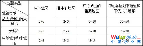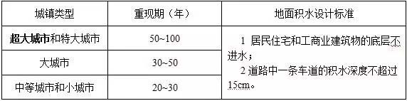 【條文說明】城鎮(zhèn)內(nèi)澇防治的主要目的是將降雨期間的地面積水控制在可接受的范圍。鑒于我國還沒有專門針對(duì)內(nèi)澇防治的設(shè)計(jì)標(biāo)準(zhǔn),本規(guī)范表3.2.4B列出了內(nèi)澇防治設(shè)計(jì)重現(xiàn)期和積水深度標(biāo)準(zhǔn),,用以規(guī)范和指導(dǎo)內(nèi)澇防治設(shè)施的設(shè)計(jì)。