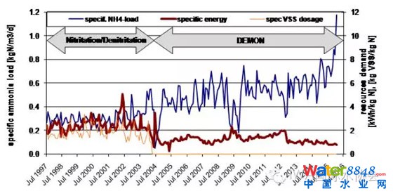 從上圖可以看出,自2004年Strass污水廠引入側(cè)流DEMON技術(shù)后,無(wú)需再外加碳源即可進(jìn)行脫氮,脫氮的能耗也隨之降低近一半。自2016年初工廠還采用了最新的分離富集設(shè)備代替原先的旋流分離器,側(cè)流系統(tǒng)的氨氮負(fù)荷可提高至1.0KgN/m3/d以上,并穩(wěn)定運(yùn)行。