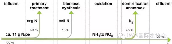 奧地利國(guó)家標(biāo)準(zhǔn)中要求污水廠的年總氮去除率需高于80%。Strass污水廠進(jìn)水總氮負(fù)荷為每人口當(dāng)量(PE)每天11gN(TN濃度約為55mg/L)。下圖為氮平衡圖。側(cè)流厭氧氨氧化去除約20%-25%的總氮,主流厭氧氨氧化去除約45%的氨氮,剩余20%排放(TN排放年均濃度小于5mg/L)。
