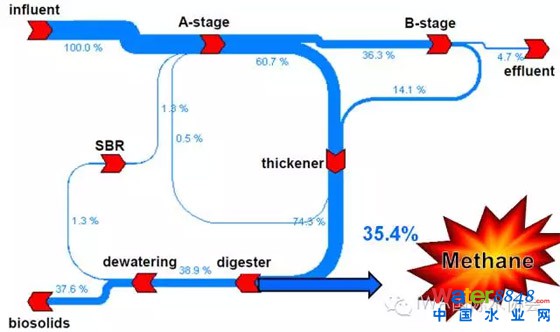 采用傳統(tǒng)AB處理工藝的奧地利Strass污水廠,因在能源自給方面取得的成功而名聲大噪。早在20世紀(jì)90年代,Strass污水廠就開(kāi)始關(guān)注如何能在滿足工廠運(yùn)行之外實(shí)現(xiàn)產(chǎn)能。其合理性在于污水中蘊(yùn)含的能量遠(yuǎn)高于處理污水所需的能耗。典型的歐洲污水按人口當(dāng)量計(jì)算,理論上污水中蘊(yùn)含的能量為18W/person,而處理污水的能耗約為5-7W/person。